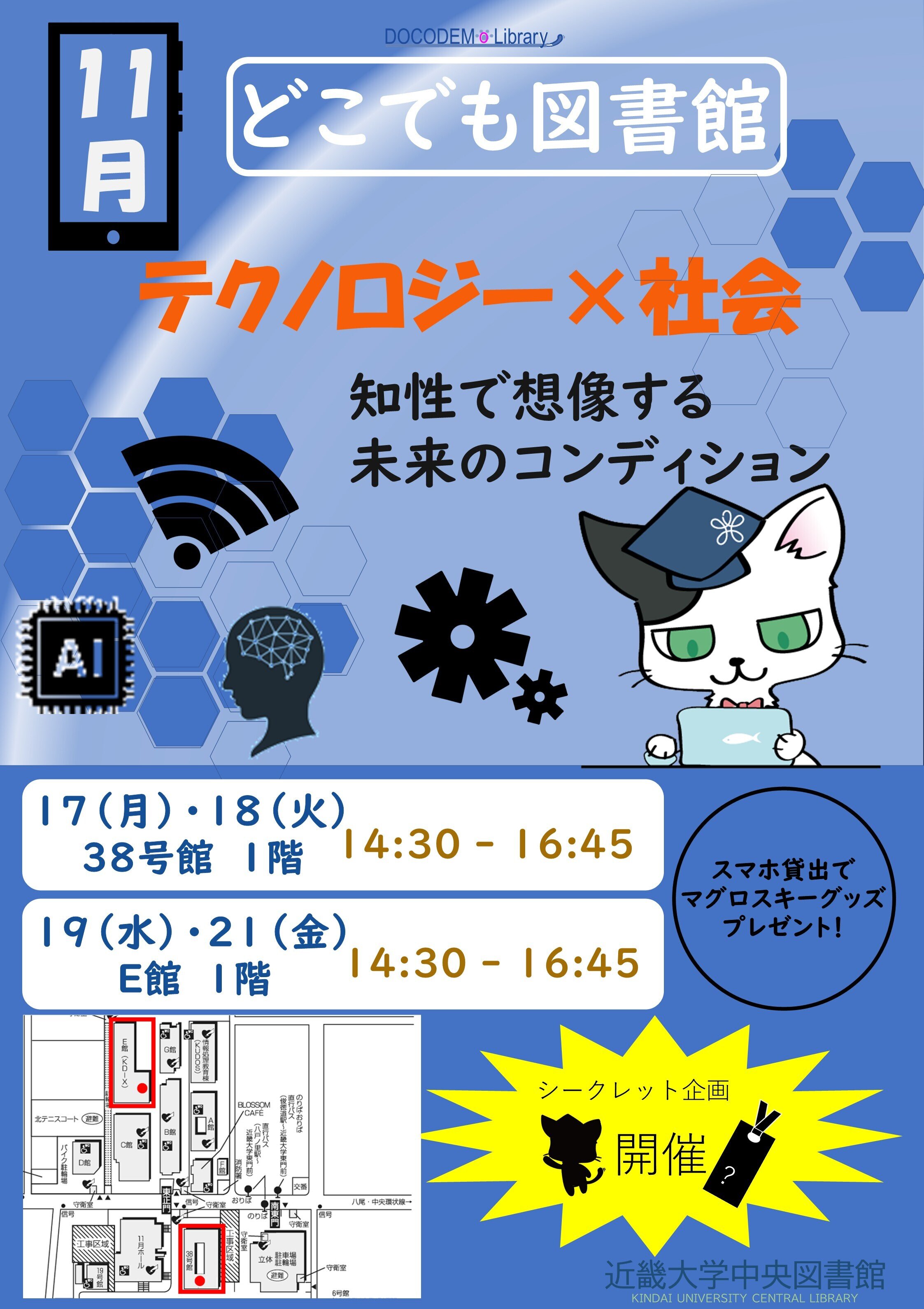 11月17日(月)・18日(火)14:30-16:45 38号館1階ロビー11月19日(水)・21日(金)14:30-16:45 E館1階ロビー