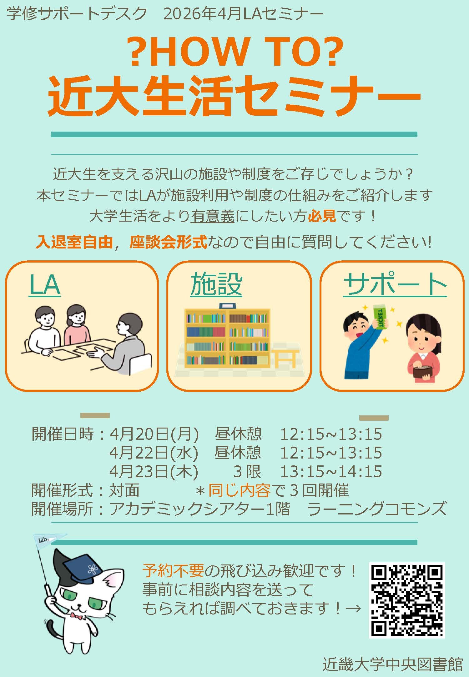 LAセミナー「近大生活セミナー」開催のお知らせ(4月20日・22日・23日)